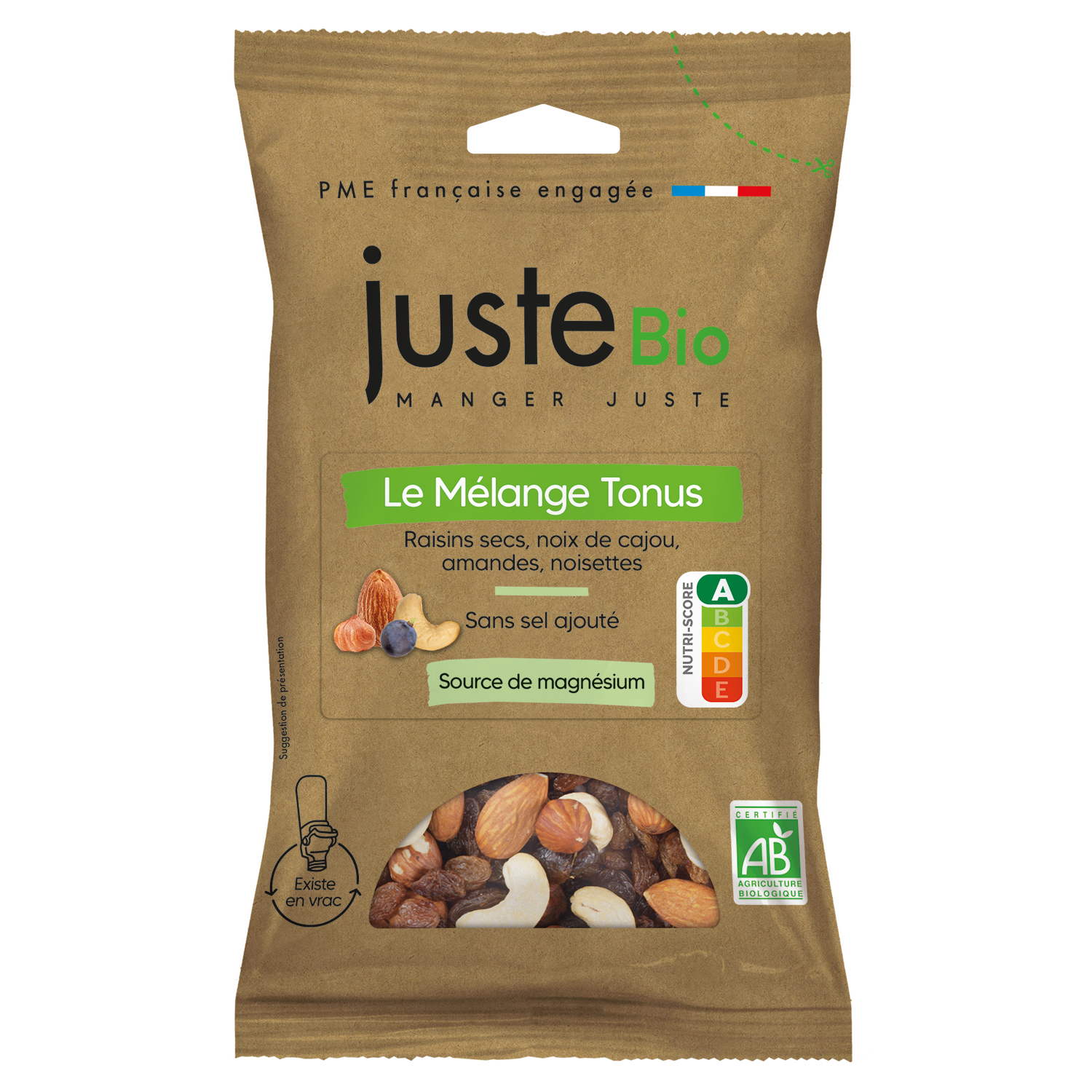 Au cœur de cette gamme, retrouvez par exemple notre mélange tonus, un mélange iconique qui marie à merveille le croquant de l’amande et des noisettes, la douceur de la noix de cajou et la légère acidité des raisins secs. Un mélange délicat et subtil, source de magnésium qui aide à réduire la fatigue. A noter que ce mélange, sans sel ajouté, sans sucre ajouté et sans huile ajoutée affiche un Nutriscore A.
