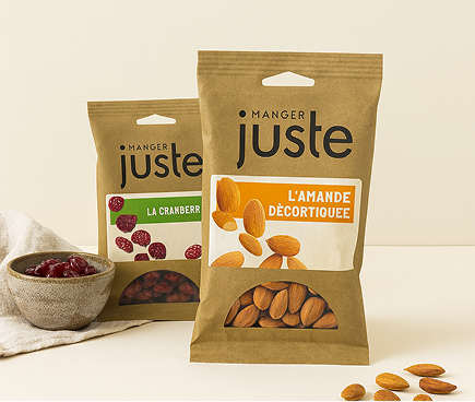 Pour répondre à tous les instants de consommation, Manger Juste propose également une gamme de 27 références en sachets, pratiques à emporter partout avec soi. Grâce à leurs sachets entièrement recyclables en filière papier, fini les sachets à la noix !